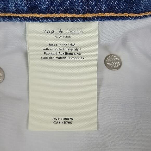 Cut-off denim short shorts from Rag and Bone. The Justine shorts feature classic five pocket styling, high waist, and a zipper/button front closure. In the blue color wash Charlie. Unfinished raw hemline with small side slits. The cuffed ends are uneven and were most likely created by the previous owner as stock photos show the shorts without cuffed ends. Pre-owned and in good condition without any visible flaws, holes, or stains. In women's size 27.
