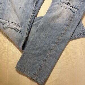 Distressed Skinny jeans perfectly torn to show off some knee. Faded to a pale blue denim. Very good condition. Inseam measures 28”