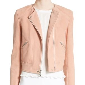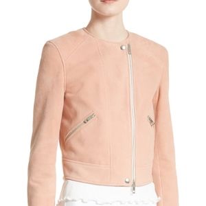 Buttery-soft suede, collarless styling and cropped, fitted proportions provide a feminine makeover to an of-the-moment moto jacket. Color is a pinky peach.