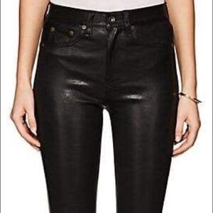 Crafted from exquisite glazed black stretch lamb leather, these showstoppers redefine sleek. Designed with faux front pockets and patch-style back pockets accented by vertical seams and a signature designer logo for a subtle lifting effect. Finished with belt loops, knee seam detailing, and a sculpted, skin-tight silhouette that hugs every curve.