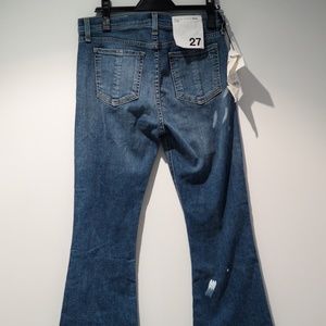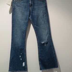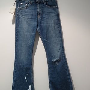 Rag and Bone distressed jeans featuring a small paint splatter, rip in the knee and flared distressed bottom.