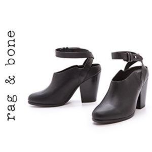 Rag & Bone Kenny leather mule booties. Leather ankle wrap with push pin closure, closed almond toe, leather upper and lining, made in Italy. 3" heel