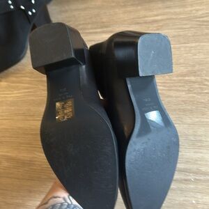 These black Chelsea ankle boots feature a smooth leather finish and convenient elastic side panels for easy wear. The sleek design is complemented by a slightly pointed toe and a low stacked heel, making them a stylish choice for any occasion.