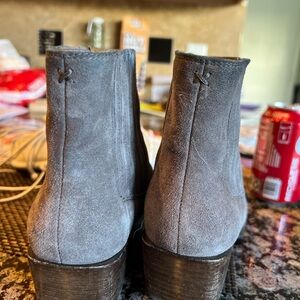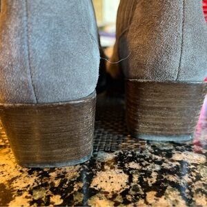 Stylish gray suede women’s ankle boots with a stacked low heel. Soft suede upper provides comfortable wear and a sleek look. Versatile gray color pairs easily with casual and dress outfits.