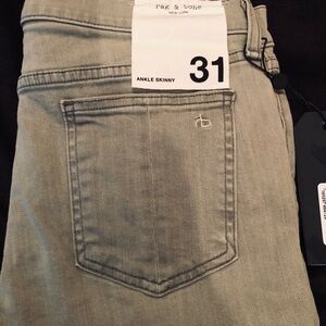 NWT-Rag and Bone ankle skinny jeans in stretch denim. Mid rise, belt loops, button/zip fly. Five pocket style, fitted through skinny legs, ankle length, raw edge hem. Size 31, originally $195.00