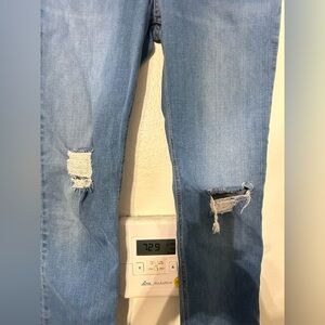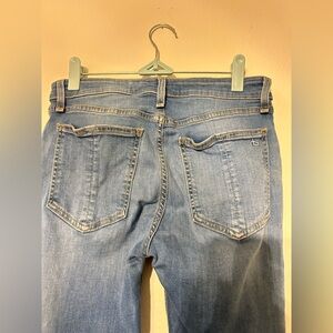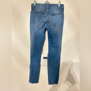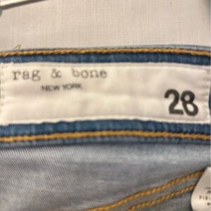 These rag & bone skinny jeans in a versatile blue hue feature intentional distressing for a modern, casual look. The denim's faded appearance adds character, while the frayed hem detailing at the ankles enhances their contemporary style.