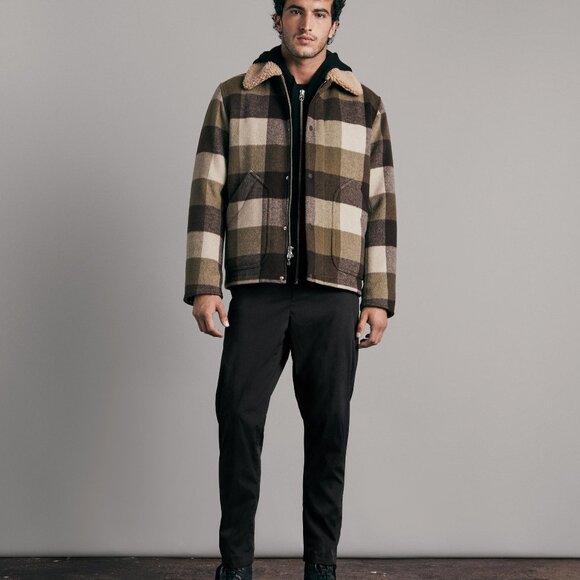 rag & bone's 'Lane' jacket is patterned in tonal-green and brown checks that nod to utilitarian styles. Made from wool-blend felt and cotton-blend corduroy, it's topped with a faux shearling collar and is fully lined for smooth layering. The front pockets are sewn at an angle. Features a snap button front with storm placket and heavy duty custom-made double zipper.