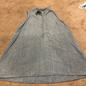 Effortless Light Wash Denim Sleeveless Shirtdress. This casual yet chic dress features a soft, light wash denim-like fabric in a relaxed A-line silhouette. It has a classic collar, a partial button-down placket, and a sleeveless design. Perfect for a comfortable, laid-back, and stylish everyday look! Timeless Rag & Bone/JEAN tent dress rendered in crisp chambray. A fold-over collar and buttoned half-placket lend a touch of structure. Sleeveless. Unlined.
