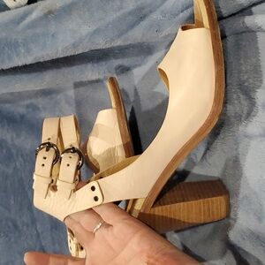 Light peach pink peep toe double ankle closure stacked heel sandals by rag & bone size 40 great used condition with minor wear.