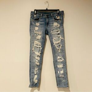 Exposed stitching outlines the internal patches that back the dramatically shredded legs of slim-cut boyfriend jeans cast in an ultra-faded light blue wash.