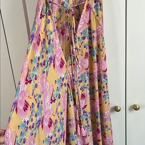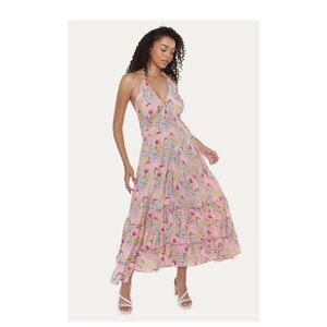 Embrace elegance with this stunning bird floral halter maxi dress. Perfect for any occasion, this dress features a beautiful blend of pink and cream hues. Ideal for making a statement.