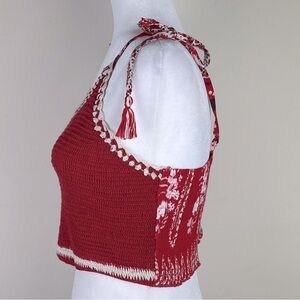 Crocheted crop top. Smocking on the back. Tasseled shoulder ties. Red and cream.