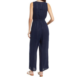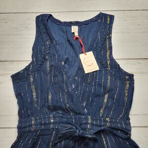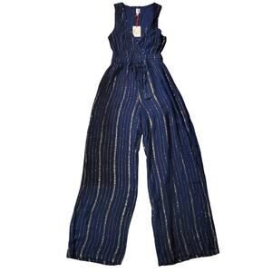 Raga Dusk Till Dawn Jumpsuit Striped Embroidered Surplice V Neck Blue Gold XS