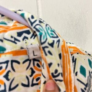Vibrant button-up shirt with orange, black, and white patterns. Perfect for a bold look. Super Comfortable