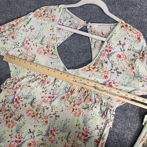 Features: mint green mini dress, pink floral print, v-neck, long sleeves, ruffled detailing, back cutout, lightweight