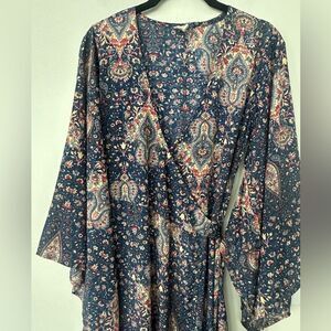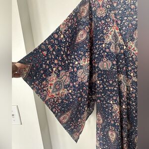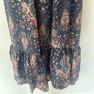 This dress features a paisley print and a tiered design. Some versions of the Poseidon Maxi dress are tiered and have an open back with tassel halter ties.