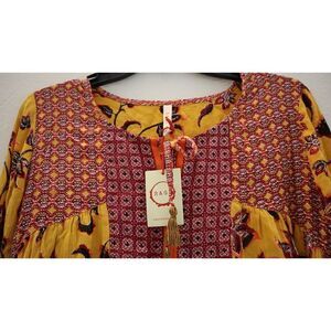 Raga R3872 Women's Sz 2 Mustard V-Neck Crinkle Woven Boho Babydoll Top