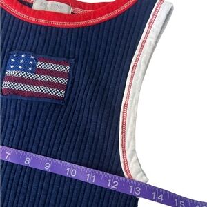 Ragabond Studio x Free People collaboration tank top! This unique ribbed knit crop top features a classic navy blue body with contrasting red trim around the neckline and white ringer details on the armholes. The standout detail is the charming, subtly distressed embroidered USA flag patch on the front, giving it a cool, vintage-inspired vibe.