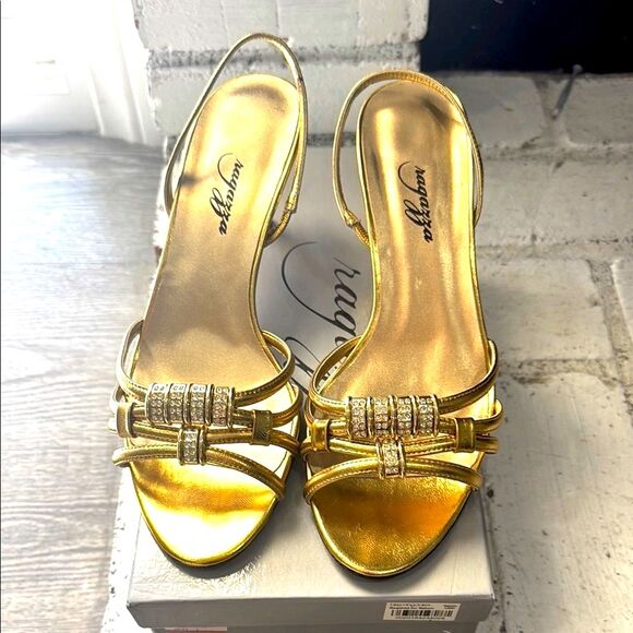 Ragazza Helena Sandal Kitten Heels Slingback Gold Metal Rhinestones Size 8.5