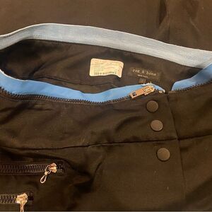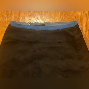 This flat front satin skirt features features a contrast leather waistband with zipper teeth trim,