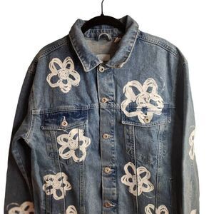This jacket features a classic trucker denim style with a unique twist - the daisy design adds a playful and youthful touch. The distressed detailing gives it a worn-in look, adding to its cool and casual vibe.