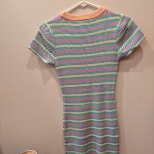 This pastel striped cable knit dress is cute, fun and comfy to wear and add to your day to day wardrobe.