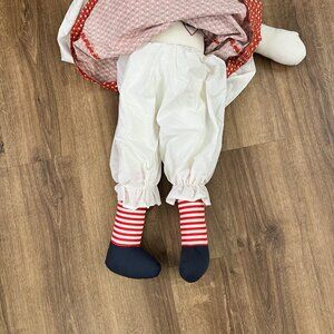 I just adore Raggedy Ann dolls and this one is particularly well made. It is a homemade doll but unbelievably craftsmanship. The outfit has a holiday flare but that is mostly the bow. Larger size and ready to be loved. The heart is embroidered with "I love Colleen"