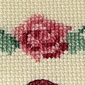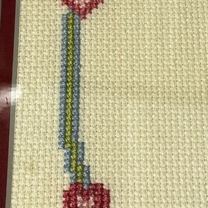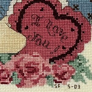 The cross stitch is in a red frame with red and blue mattes. There is writing on the back of the frame. Overcall good condition due to the frames having some minimal scuff marks and a nick out of one corner.
