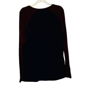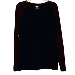 Long sleeve raglan tee in blue and burgundy, size L. Approx flat pit to pit 21", flat length 30".