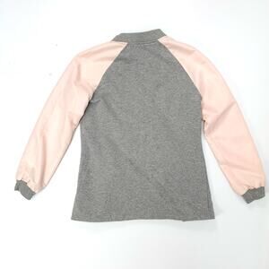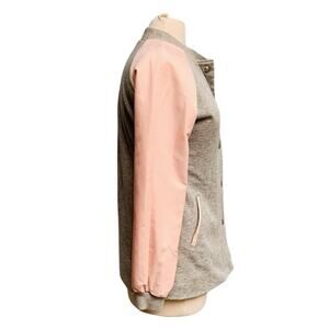 Candies gray and pink raglan colorblock contrast sleeves, snap button up, faux zip breast pocket, faux pockets, has stretch, displayed on women’s size medium (8-10) dress form, overall good gently worn preowned condition