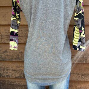This 3/4 sleeve raglan shirt combines a soft grey body with vibrant graphic sleeves, featuring a unique Halloween-inspired design. Versatile and stylish for casual wear.