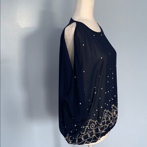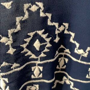 Cute raglan split sleeve top. Great with shorts, jeans or skirt. Navy with white embroidery. Length from shoulder is 23 inches. Elastic bottom. Size M