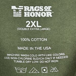 Show off your patriotic spirit with this Rags Of Honor T-Shirt in size 2XL. The green cotton knit fabric is adorned with a Don't Tread On Me print accent, making it perfect for individuals who embody the characteristics of a soldier, warrior, or militia. The crew neck and long sleeves provide a comfortable fit and the shirt is machine washable for easy care.