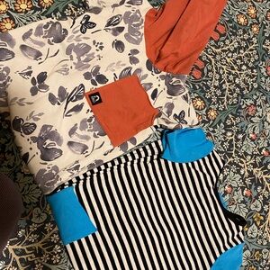 Set of two kids' rags. One features a floral pattern with a rust hood and pocket. The other has black and white stripes with blue sleeves and pockets.