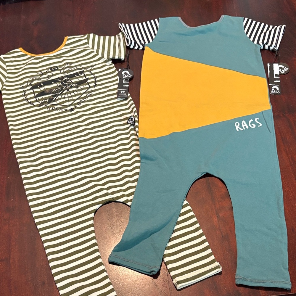 Stylish NWT Rompers by Rags to Raches. Features olive green and off white stripes. Bold color block design in yellow and blue.