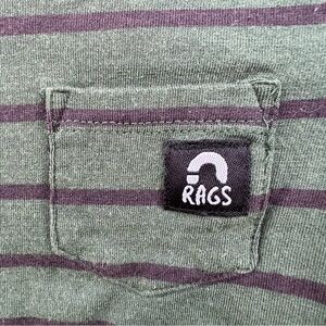 Rags to Raches Striped Long Sleeve T-Shirt. Size 6-12 months. Green with Blue stripes. Front patch pocket.