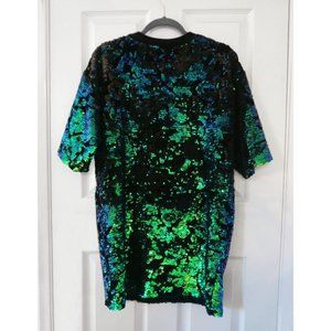 Small but VERY oversized fit (I'm a 6/8 medium and it was big on me). Length-wise, came down to mid-thigh on my 5’1” self but probably a mini for most. Some fading on sequins on the inside sleeve, negligible.