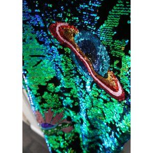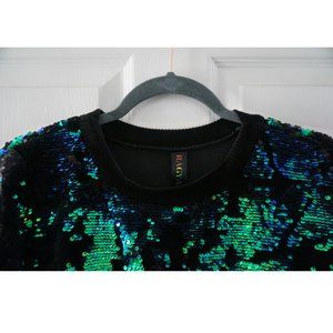 Live your best space princess life in this amazing t-shirt/sweater dress from UK brand Ragyard. Sparkling iridescent sequins in a marbled pattern on black velvet with planet and UFO sequin patches. Rib velvet at the collar. Has some weight to it, with a nice drape.