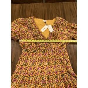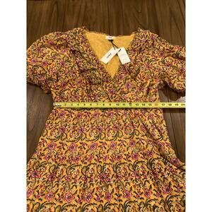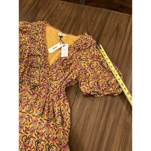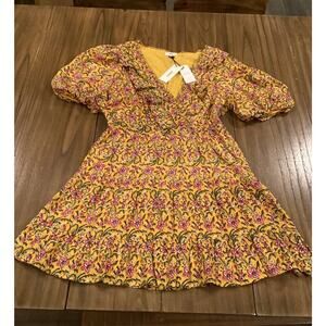 Rahi Del Sole Chiara cotton Mini Dress puff Sleeves Lined Floral V Neck ruffle Yellow XL NWT
