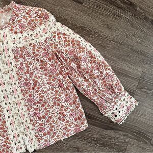 Delicate florals and touches of dainty lace infuse this blouse with feminine sophistication.