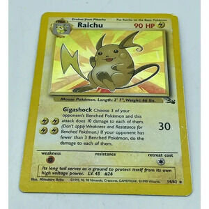 This vintage Raichu card from the Fossil set is a must-have for any Pokémon TCG collector. With a holographic finish and a rarity level of Holo Rare, this card is a true gem. The card features Raichu, a Mouse Pokémon with 90 HP and a Stage 1 evolution.