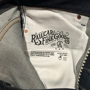 Premium Railcar Fine Goods raw selvedge jeans, handmade in Monrovia, California. These jeans are unworn and unwashed - ready to break in and fade uniquely to you. The inseam was custom hemmed in-house by Railcar (finished inseam ~28–29”).