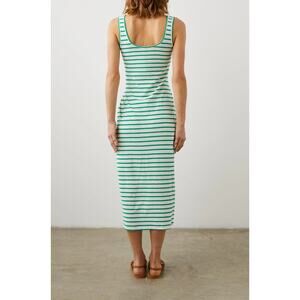 This dress by Rails is in excellent condition! It is a pull on style with tie details at the waist and slits up the sides. Color is sailor stripe green, fabric is a soft lightweight cotton with a bit of stretch. Dress is a midi style length. Perfect for vacation/getting away, relaxing on the beach. Excellent condition, no flaws.
