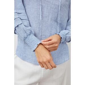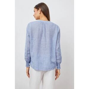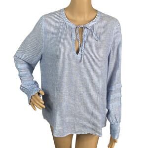 This top by Rails is a pull over style with ties at the neck (keyhole neck). Top has pleated details on the sleeves and smocked elastic cuffs. Fabric is a lightweight linen/rayon blend with a blue and white striped pattern. Minimal wear, top is in excellent condition!