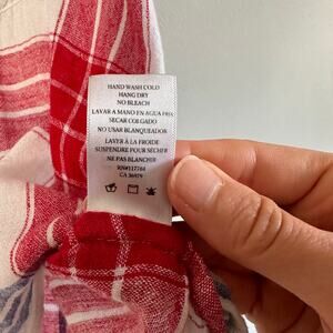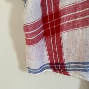 Rails Amelie Carmine Linen Blend Tie Front Shirt. Excellent gently used condition. Cap sleeves, a button down front, and knotted tie waist. Allover white, blue, and red plaid print. Button front. Collared neck. Chest pocket. A2