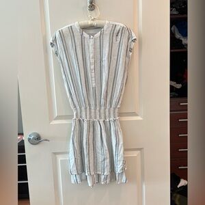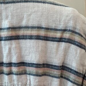 Beautiful linen blend mini dress with a multicolored stripe pattern and an elastic waist.