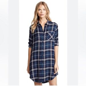 Rails Bianca shirt dress in medium size, featuring a plaid pattern in petrol blue and spruce white colors. Made from 100% rayon, this 90s-inspired dress has a collared neckline and long sleeves. Excellent preowned condition with no defects noted.
