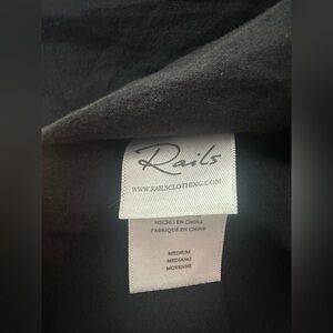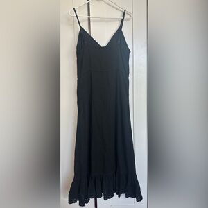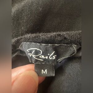 This chic black sundress by Rails features a sleeveless design with delicate spaghetti straps and a flattering v-neckline. The high-low hemline is adorned with ruffles, adding a playful touch to its elegant silhouette. Perfect for a cocktail party or a night out, this dress combines style and comfort effortlessly.