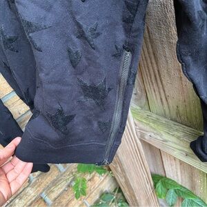 Stylish black sweater with star and heart patterns. Crew neck design. Perfect for casual wear.