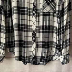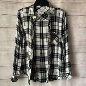 Black and white plaid button up shirt by Rails. This collared shirt has a full button down front, a pocket on the front left chest, and long sleeves with a single button cuff. It is made of a soft material. It is pre-owned and in great condition. There is very subtle pilling in some areas.